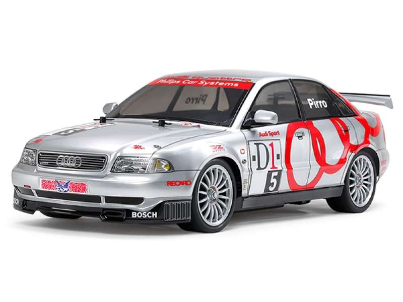 This Tamiya R/C car recreates a classic Audi A4 Quattro Touring car as it raced in 1997. In the late 1990s, manufacturer-backed teams would come to dominate touring car series around the world. One of the most pre-eminent was Audi, which spared no expense in its pursuit of the top of the podium. Using its base A4 quattro as a platform, Audi developed the car significantly and turned it into a race winner. In addition, Audi sought the best drivers from around the world in order to do their creation justice. Tamiya recreates this racer on top of the TT-01 E chassis, which is ideal for beginner kit builders. The original release of this Audi was mounted on the Tamiya TA-03 machine. TT-01 E Chassis The bathtub frame of the evolved shaft-driven 4WD TT-01 Type-E has its motor and battery close to the ground for lower centre of gravity and optimum balance. Mounted on the bathtub frame is a fiberglass reinforced nylon upper deck and gear covers improving rigidity, as well as a 3-piece tie rod providing a smoother steering action. The low centre of gravity, great balanced design, 4-wheel double wishbone suspension system, and front and rear differential gears all come together to produce excellent operating ability. 70mm-diameter radial tires are paired with metal plated wheels developed just for this model; the high sidewalls make for forgiving turns. • Separate moulded parts recreate side mirrors and sporty rear wing. • Stickers are included to recreate markings for both no.5 and no.45 cars (they raced in different touring car series), with masking stickers to help during the paint job. • 18-spoke wheels are moulded in Silver, and paired with slick tires. • The TT-01 Type-E chassis features shaft-driven 4WD for easy handling, and great customizability. • A wide range of option parts is available to tune the TT-01 Type-E chassis.